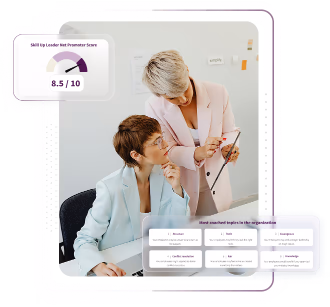 Mit Skill Up Leader bieten Sie jeder Führungskraft in Ihrem Unternehmen Zugang zu einem individuellem 1:1-Coaching. Mit den Daten von Skill Up Leader zeigen Sie auch Ihrem CEO klar, wie entscheidend HR für den Unternehmenserfolg ist
